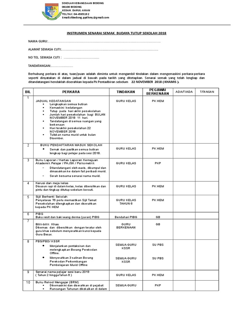 Contoh srt lantikan Shidie Luffy. Senarai Semak Budaya Tutup Sekolah. Di era pandemi saat ini pelaksanaan pembelajaran berbasis budaya di beberapa sekolah kurang dapat dilakukan dengan baik terlepas dari adanya sistem pembelajaran secara jarak jauh.